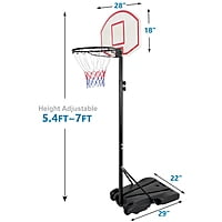 Featuresï¼ ãSolid Structureã - Constructed of heavy-duty steel, high density polyethylene backboard, a solid steel ring and an all-weather nylon netï¼for superior strength and durability ãQuality Assuranceã - The professional-grade hoopfeatures high-density polyethylene portable bases, all-weather nylon nets, a variety of height adjustments fade-resistant graphics, powder-coated steel poles, and heavy duty steel rims for years of reliable fun. ãAdjustable Heightã - The telescoping mechanism adjusts from 5.5 to 7 feetï¼no tool requiredï¼.Let kids of different age ranges and skill levels enjoy the game on their own terms,ensuring that all ages can enjoy themself during the period of playing basketball. ãEasy To Moveã - The Stand can be easily rolled or moved to your desired location for the wheels on the base.Designed of portable and lightweight, it is easy for you to assemble.Portable with Carry Case. ãAdditional Stabilityã - 9.53 gallons base fills with water or sand, ensuring safety when kids play the big rebound or the dunk. ãPlay Anywhereã - Perfect for family activity, sports game and school activity with your family and friends.it can be used on yard, garden, beach, playground and even indoors. Help your child feel like their favorite basketball superstar, practice their jump shot in spare moments or perform a backyard dunking drill.This item can give you an authentic basketball experience. Specifications: Net Material: Weather-Resistance Nylon Material: Steel Tube + PE (Base & Backboard) + Steel (Rim & Pole) Adjustable Height: 5.5' to 7' / 66" to 84" Backboard Dimension: 27.9" X 17.7" (L X H) Rim Diameter: 17" Thickness Of The Backboard: 1.2" Base Dimensions: 17.75" x 29.5" x 5" Base Capacity: 25 KG Water / 30 KG Sand Package Includes: 1 x Basketball Rack (Assembly) 1 x Basketball Net