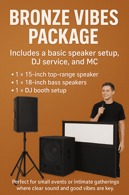 Includes a basic speaker setup, DJ service, and MC, featuring: 1 × 15-inch top-range speaker 1 × 18-inch bass speakers 1 × DJ booth setup Additional Notes: Maximum DJ service duration: 8 hours Excludes hours restricted under the Noise Abatement Act Additional Notes: Maximum service duration: 8 hours Excludes hours restricted under the Noise Abatement Act Shipping is not included Includes rental setup crew Perfect for small events or intimate gatherings where clear sound and good vibes are key.